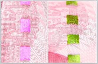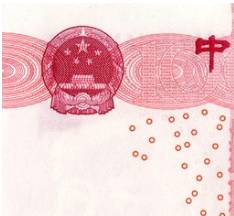 票面一侧的安全线由原来的埋在纸币内侧,改为透过设置在纸面上的一个个小窗显露出来,且透光观察可呈现红绿色更变。