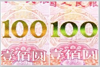 票面正面中部的“100”字样由原来的红蓝条纹绘制,改为“远看土豪金,近看翠竹绿”的亮眼色彩,且在“100”中部可见光带上下滚动。