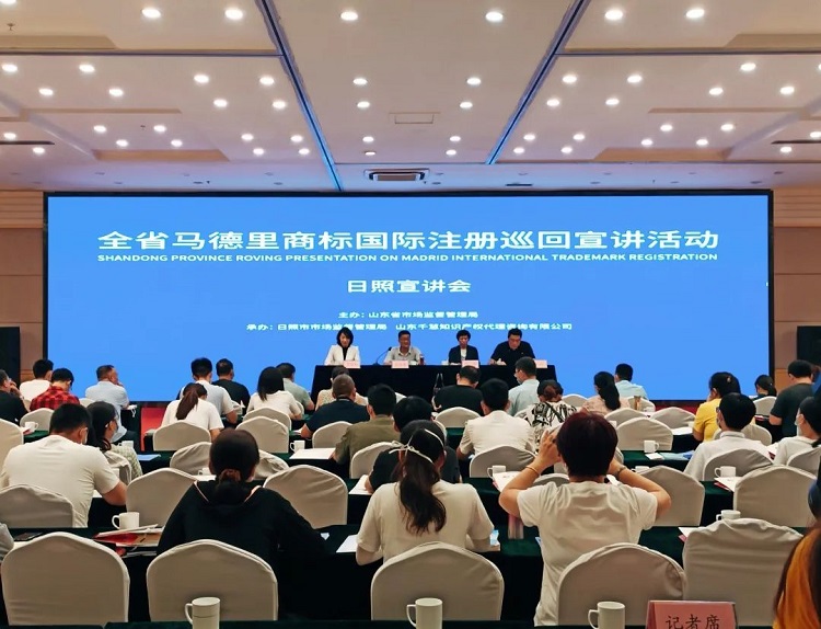 为进一步加强品牌强省建设,贯彻落实山东省政府办公厅知识产权“春笋行动”工作部署及国家知识产权局“知识产权服务万里行”工作要求,更好地推进全省马德里商标国际注册与保护工作,提升企业品牌国际化运营和商标马德里国际注册保护水平,8月19日上午,由山东省市场监督管理局主办、日照市市市场监督管理局承办、山东千慧知识产权代理咨询有限公司协办的“山东省马德里商标国际注册巡回宣讲活动”圆满举办。日照市市场监管局副局长范文青、科长陈刚,山东千慧知识产权代理咨询有限公司副总经理张峥、贾俊颖出席此次活动。