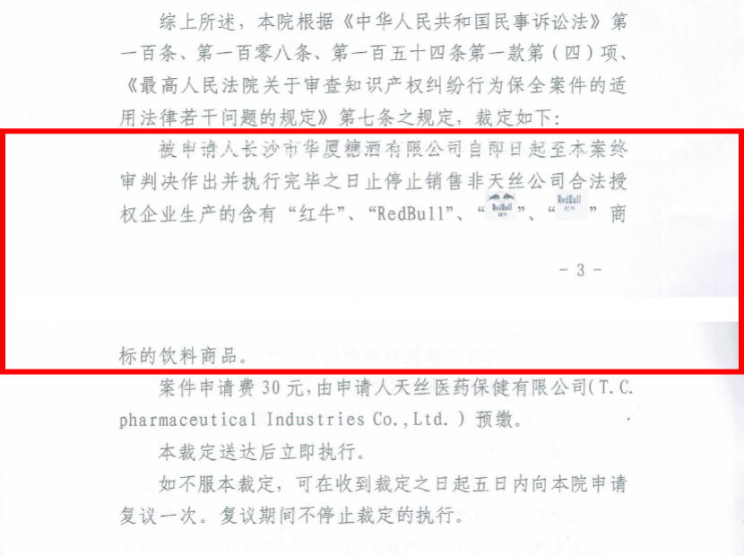 湖南省长沙市中级人民法院已于2021年5月28日依法作出“(2021)湘01民初564号之一”行为保全民事裁定书,裁定长沙市华厦糖酒有限公司“自即日起停止销售非泰国天丝医药保健有限公司合法授权企业生产的含有‘红牛’系列商标的饮料商品”。